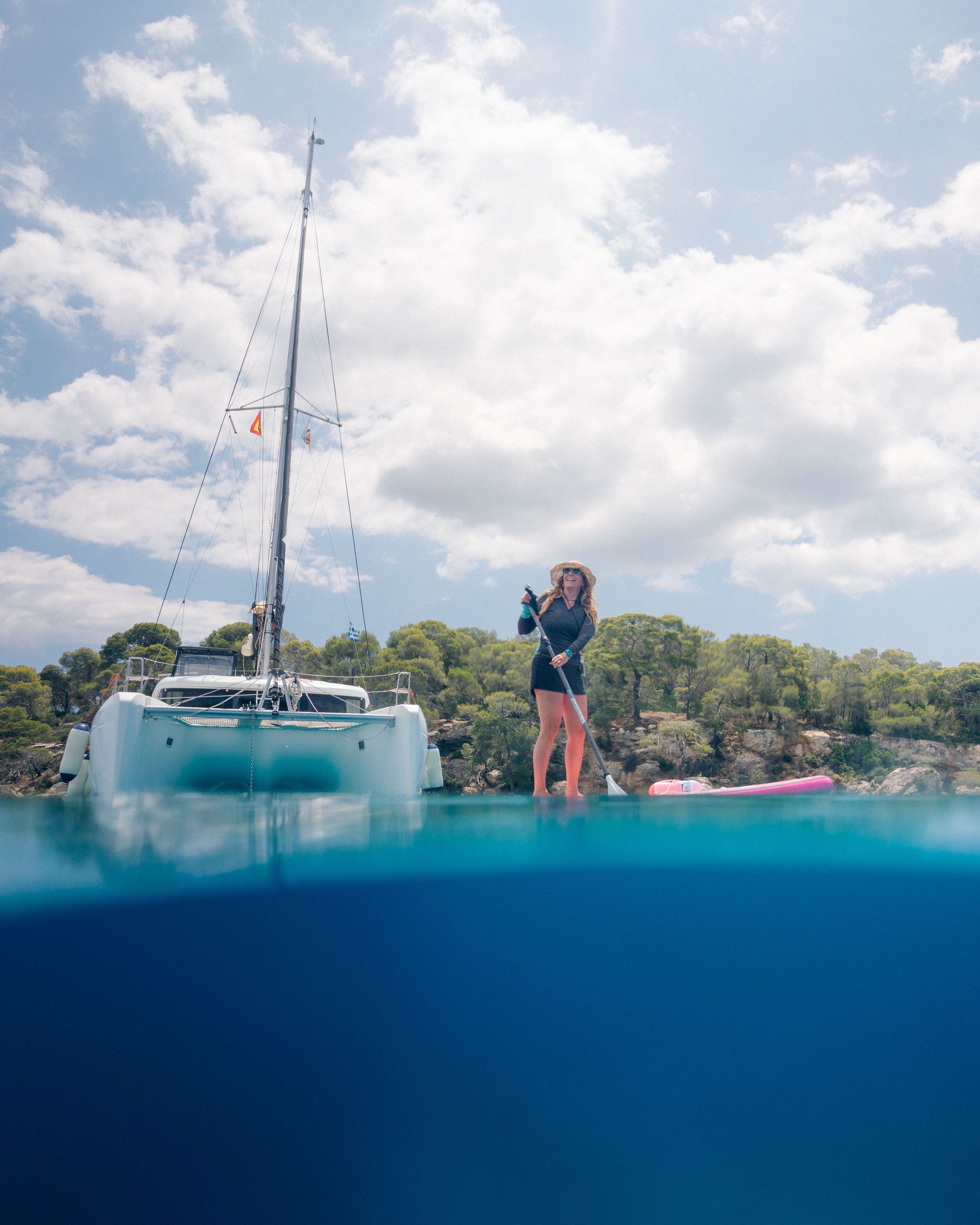 Our catamaran yacht is supported and guided by our experienced crew - including a captain, SUP guide, and hostess/cook - ensuring you have an unforgettable adventure.